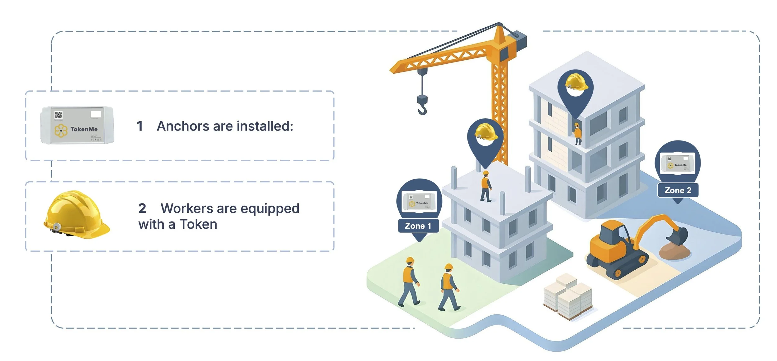 Wireless anchors and wearable smart tokens communicate to detect presence of workers, and site conditions.